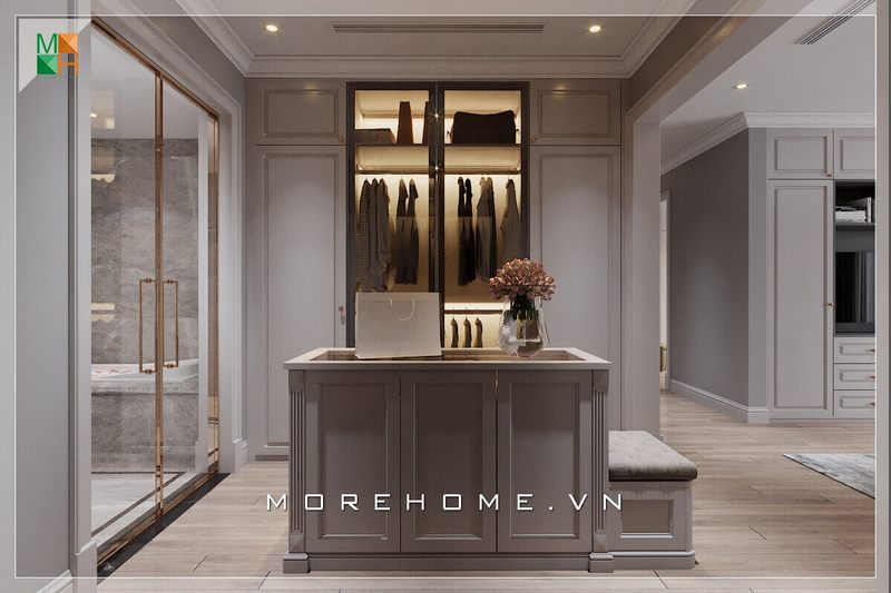 Hiện nay, xu hướng thiết kế phòng thay đồ biệt thự, nhà phố là những chiếc tủ âm tường hoặc những chiếc tủ lùa kính thay cho những chiếc tủ truyền thống trước kia. Ưu điểm của chúng đó chính là thiết kế không ngăn kéo giúp tối ưu diện tích phòng một cách triệt để.