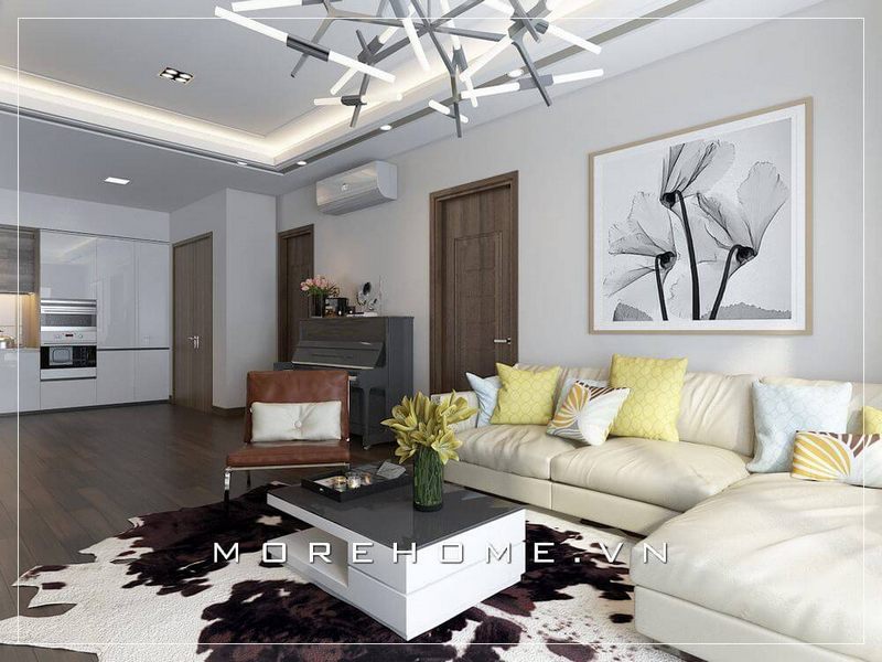 Tối ưu không gian phòng khách căn hộ chung cư với thiết kế sofa dạng góc tiện lợi cùng màu kem nhẹ nhàng sang trọng.