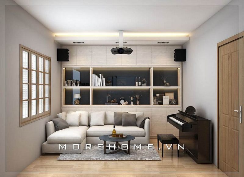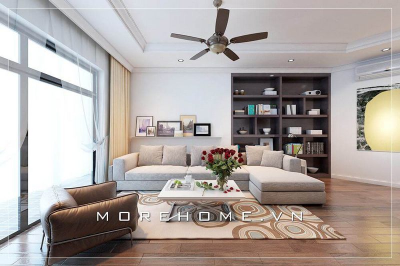 Với không gian phòng khách căn hộ thiết kế sofa kiểu dáng góc hiện đại, vỏ bọc da màu ghi tạo nên sự ấm cúng luôn được ưu tiên để tối ưu không gian