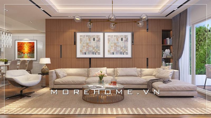 Bộ sofa góc chữ L hiện đại, bọc vải màu trắng tạo cảm giác tinh tế và sang trọng cho không gian phòng khách biệt thự