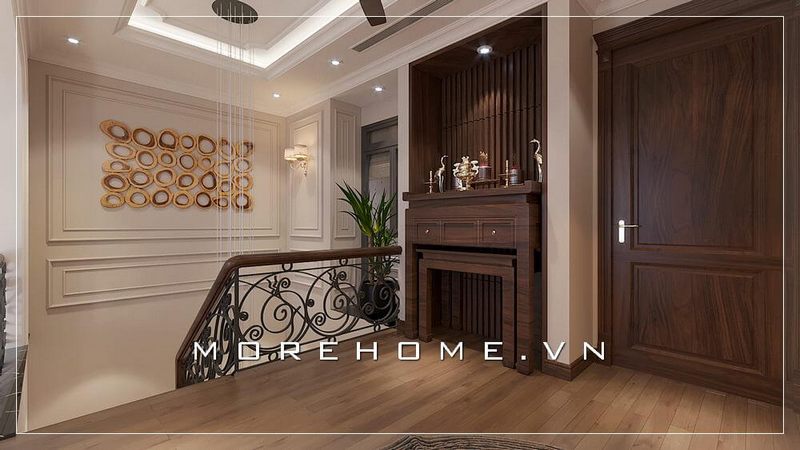 Mẫu bàn thờ gỗ tự nhiên biệt thự được đặt ở vị trí tầng 2, KTS đã khéo kéo thiết kế tường âm để tạo không gian riêng tư để bàn thờ với tường ốp gỗ mang đến vẻ đẹp sang trọng và cao cấp