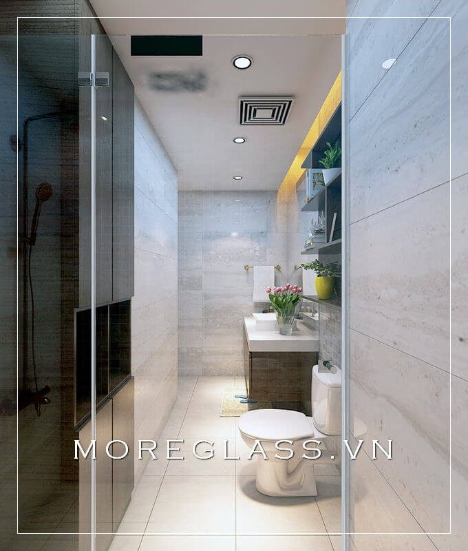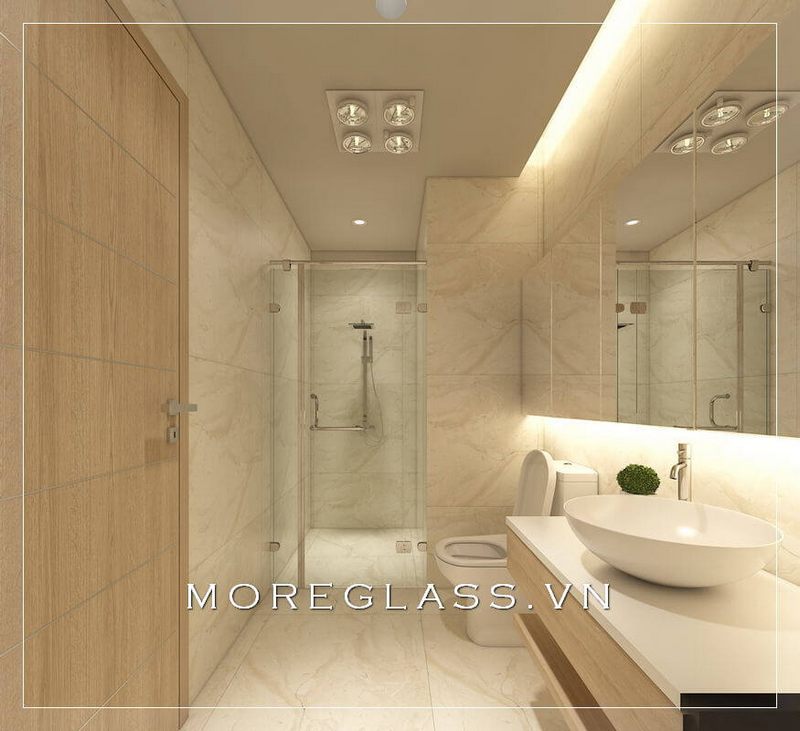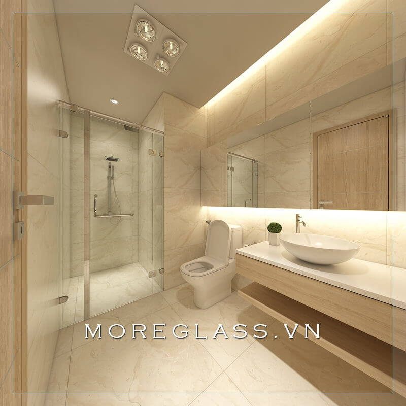 Mẫu thiết kế nhà tắm đẹp, nổi bật với vách kính đứng hiện đại giúp tách biệt hai không gian căn phòng và phòng tắm.